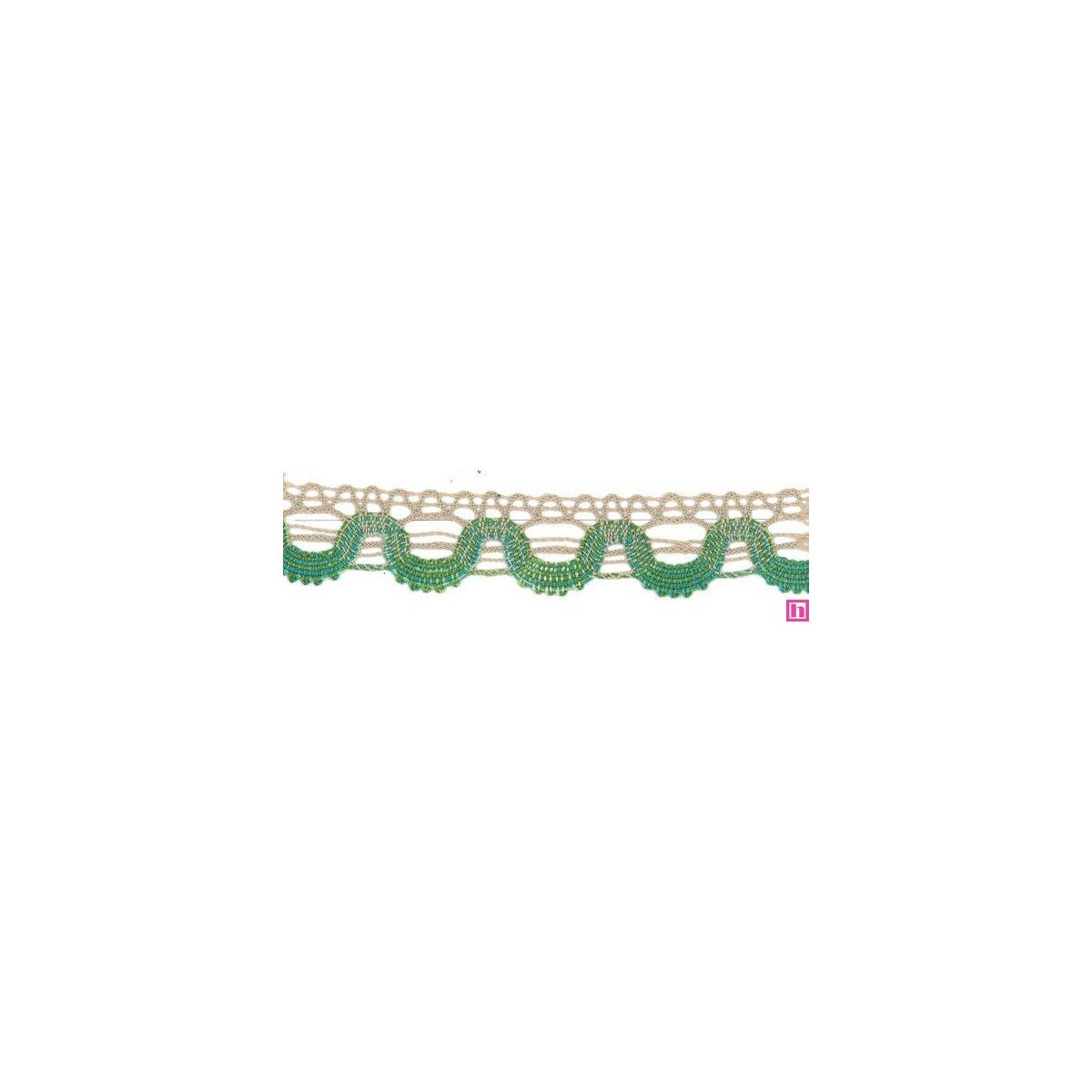 56829 ANAUEL PUNTILLA BOLILLO 30 MM. POLIESTER 50%-ALGODON 50% CAMEL/VERDE MATIZADO Venta en piezas de 15.00 M