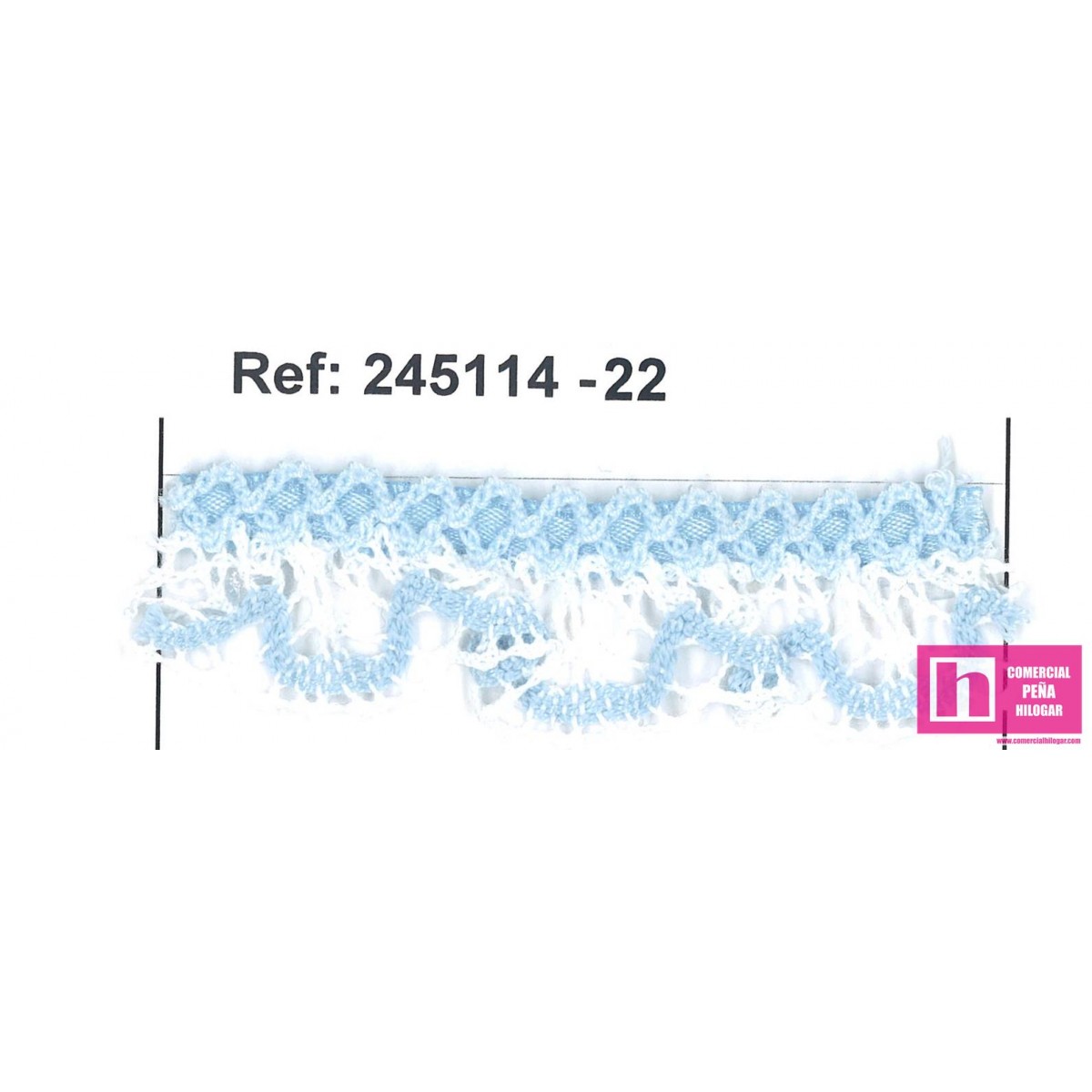 245114-22 PUNTILLA BOLILLO FRUNCIDA SIMONA 20 MM. POLIESTER 100% BLANCO/CELESTE Venta en piezas de 25.00 M
