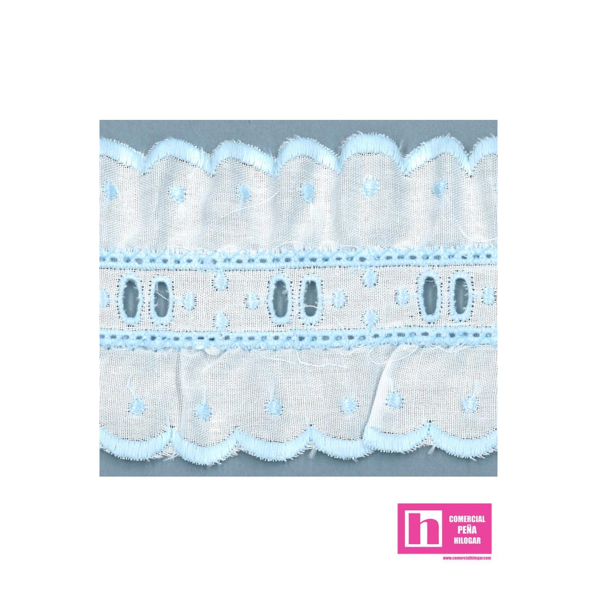 97/11695-3 GALON BORDADO FRUNCIDO JACOBELLA 50 MM. POL.60%-ALGODON 40% BLANCO/CELESTE Venta en piezas de 11.00 M
