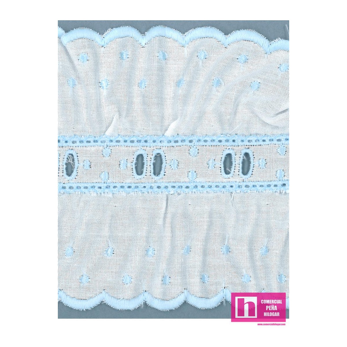 97/11694-3 GALON BORDADO FRUNCIDO JACOBELLA 80 MM. POL.60%-ALGODON 40% BLANCO/CELESTE Venta en piezas de 11.00 M