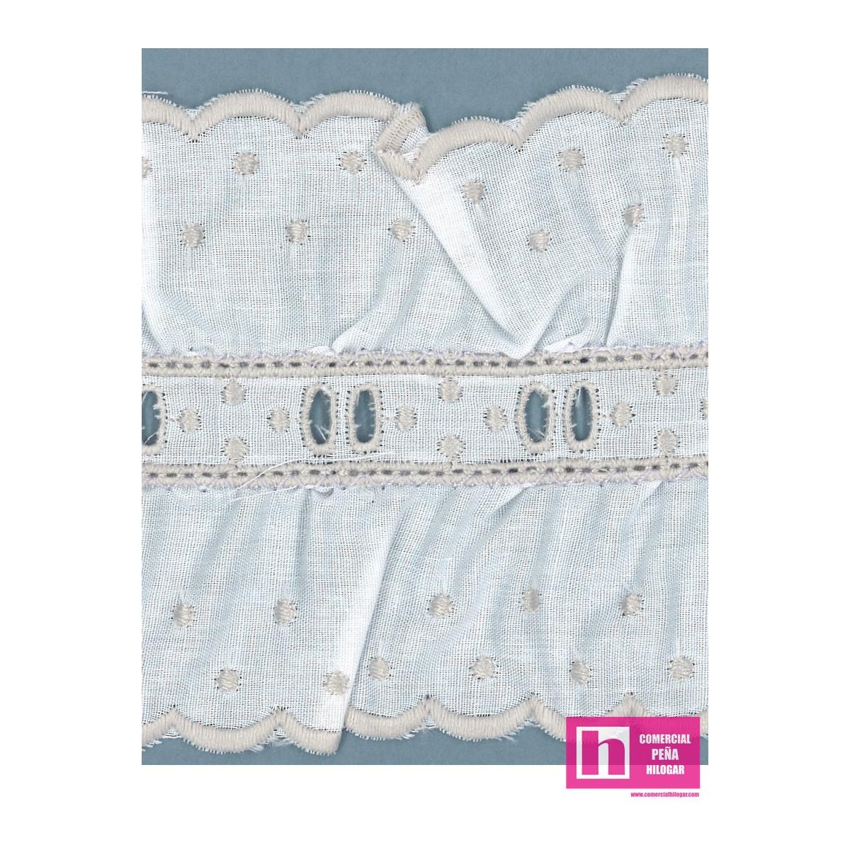97/11694-29 GALON BORDADO FRUNCIDO JACOBELLA 80 MM. POL.60%-ALGODON 40% BLANCO/GRIS Venta en piezas de 11.00 M