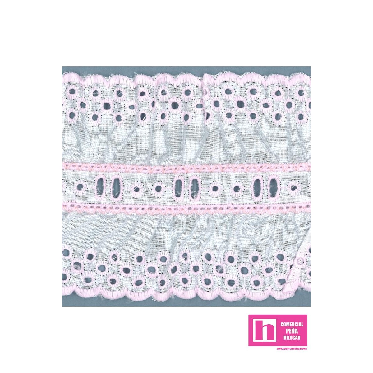 90/11786-7 GALON BORDADO FRUNCIDO ALFONSINA 75 MM. POL.60%-ALGODON 40% BLANCO/ROSA Venta en piezas de 11.00 M