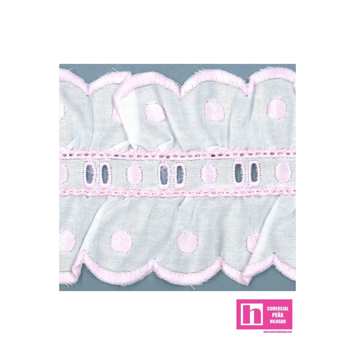 Vista rápida 02/11700-3 GALON BORDADO FRUNCIDO LIONETTA 75 MM. POL.60%-ALGODON 40% BLANCO/CELESTE Venta en piezas de 11.00 M
