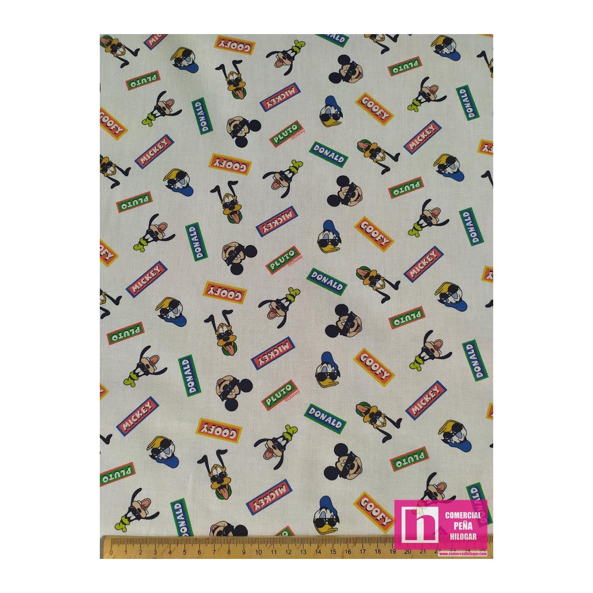 62829 TEJIDO ESTAMPADO MICKEY SUNGLASSES (01) 1.50 M. ALGODON 100% BLANCO Venta en piezas de 10.00 M