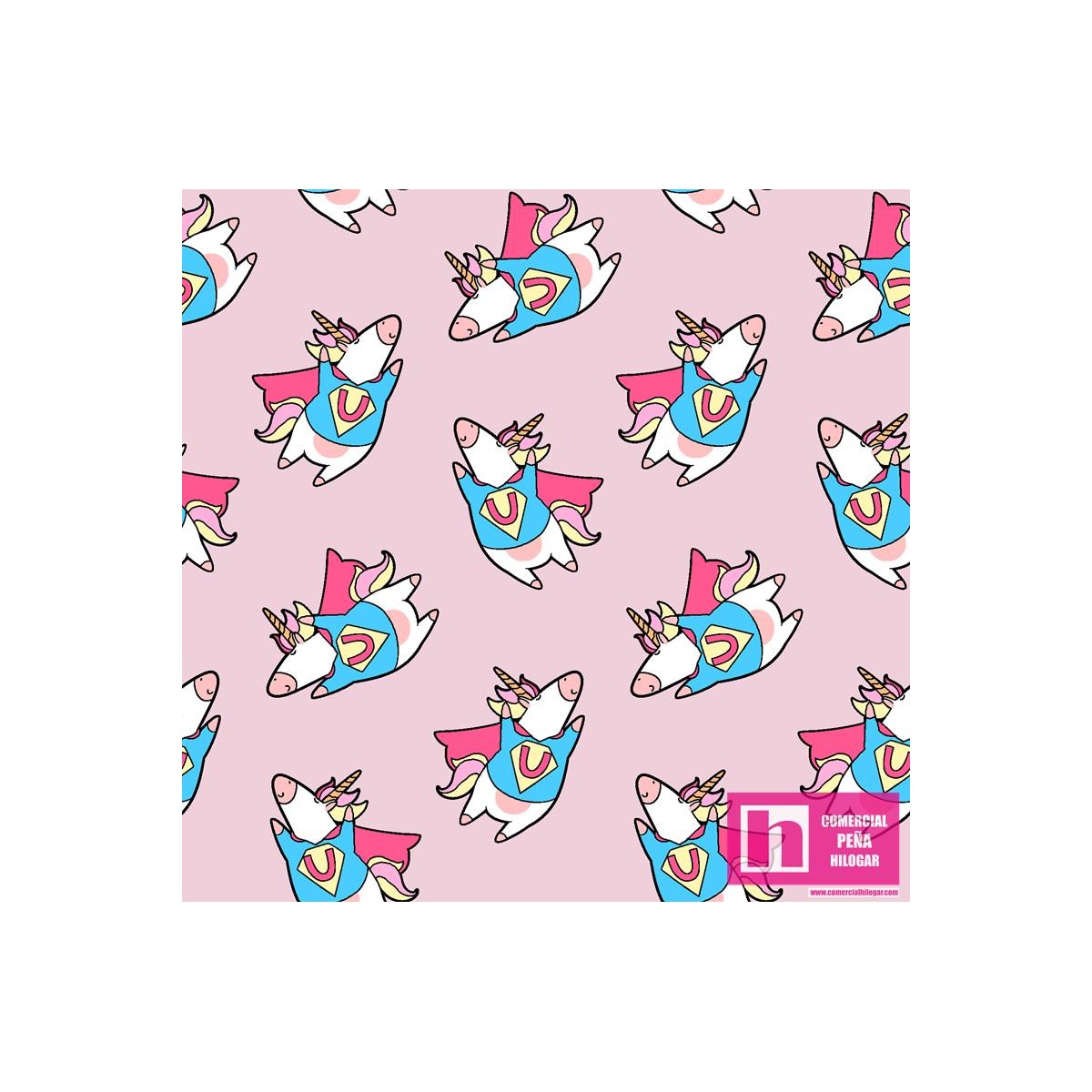 62712 TEJIDO ESTAMPADO SUPER UNICORNIO (01) 1.50 M. ALGODON 100% ROSA Venta en piezas de 5.00 M