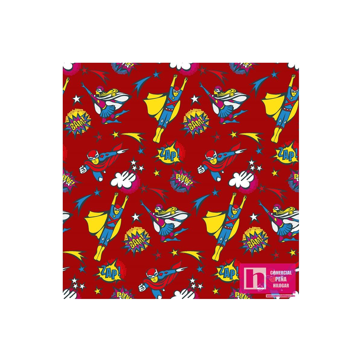 62711 TEJIDO ESTAMPADO EURO HEROES (01) 1.50 M. ALGODON 100% ROJO Venta en piezas de 5.00 M