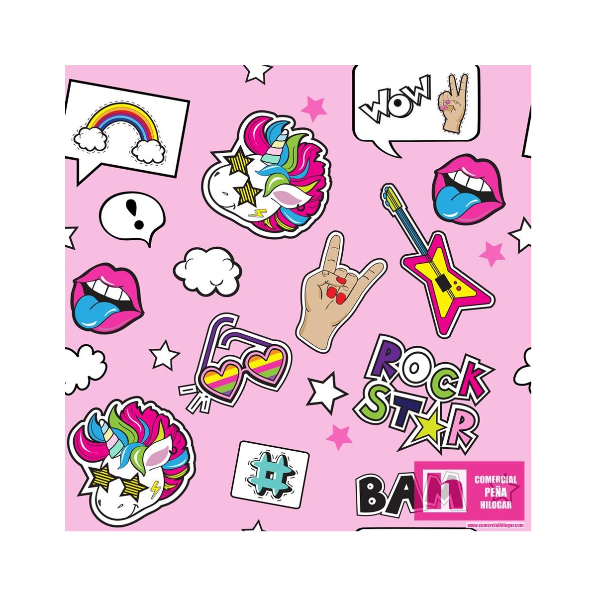 62720 TEJIDO ESTAMPADO UNICORNIO ROCK STAR (02) 1.50 M. ALGODON 100% ROSA Venta en piezas de 5.00 M