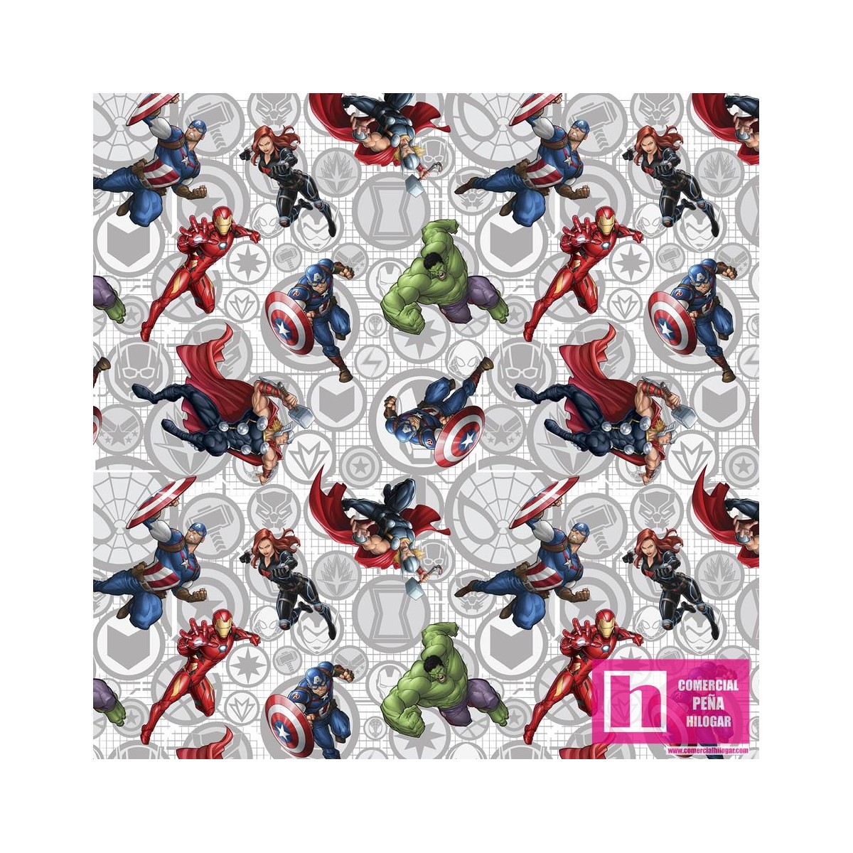 62734 TEJIDO ESTAMPADO MARVEL VENGADORES ATTACK (04) 1.50 M. ALGODON 100%. 180 HILOS. GRIS Venta en piezas de 10.00 M