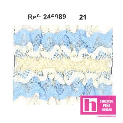 245089-21 GALON FRUNCIDO OMERO TRIO 60 MM. POLIAMIDA 100% MARFIL/CELESTE Venta en piezas de 25.00 M