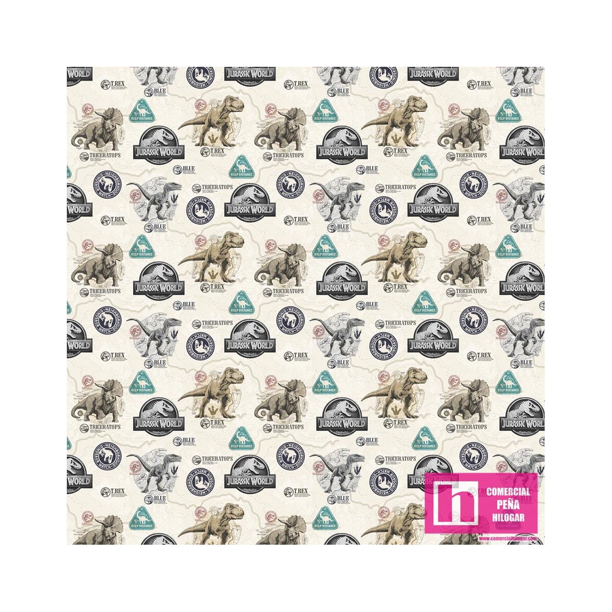 62762 TEJIDO ESTAMPADO JURASSIC WORLD DINO (03) 1.50 M. ALGODON 100%. 180 HILOS. BEIG Venta en piezas de 10.00 M