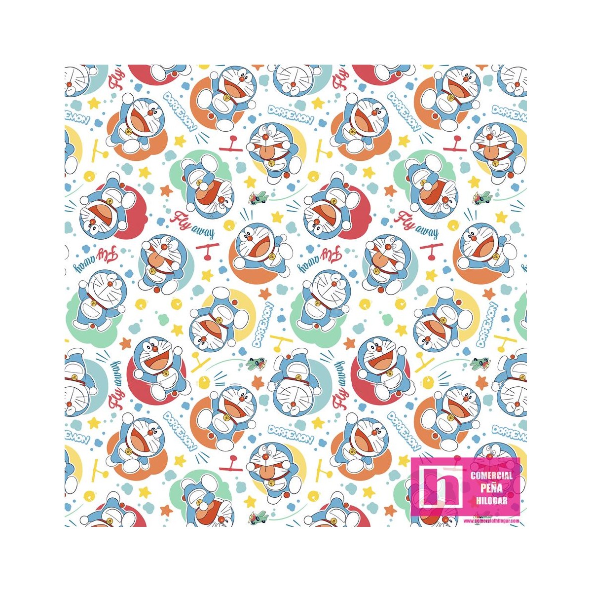 62761 TEJIDO ESTAMPADO DORAEMON FLY (01) 1.50 M. ALGODON 100%. 180 HILOS. MULTI Venta en piezas de 10.00 M
