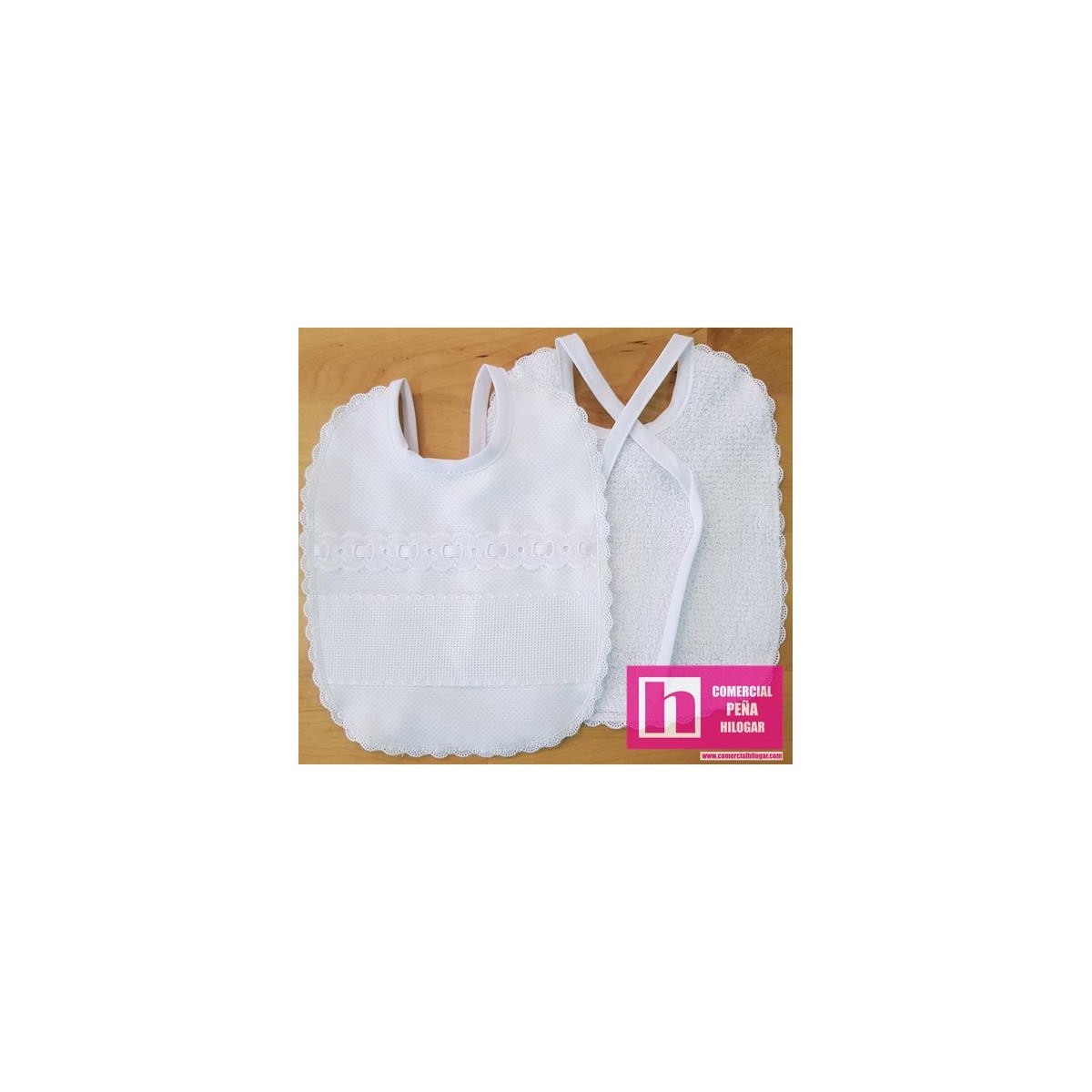 Vista rápida 982921-011 CARMELA BABERO 18X21 (01) PIQUE+PANAMA+PUNTILLA POLIESTER 60%-ALGODON 40% BLANCO/ROSA Venta en piezas de...